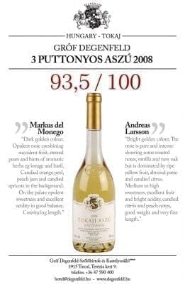 De Aszú 3 Puttonyos 2008 is recentelijk door ’s werelds beste wijnsommeliers Andreas Larsson en Markus del Monego geproefd. Zij waren dusdanig onder de indruk dat zij de Tokaji een bijzonder hoge gemiddelde score van 93,5 punten gaven!